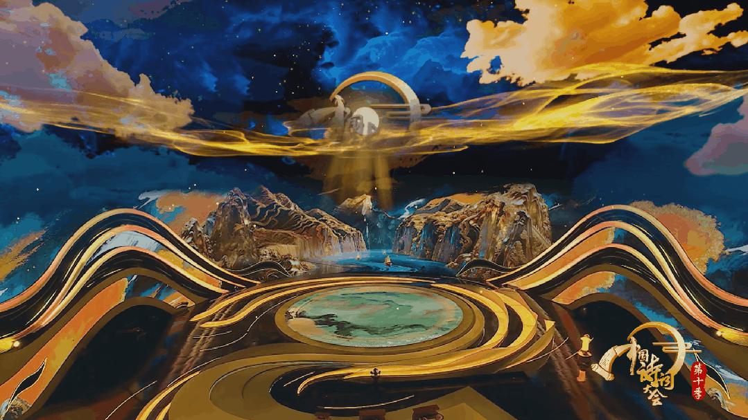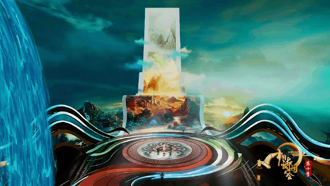 《中国诗词大会(第十季)》创新运用特殊的光效和绘制解算手法,将虚拟视觉空间的质感打造成电影画面的肌理感,光、空气、画面的细腻性和柔和度充满了呼吸感。整体空间波澜起伏的海浪和矫健飞腾的巨龙形成强烈的视觉冲击,龙身似水晶、似流水的材质配合流畅飞舞的运动,首次嫁接使用流体算法,骨骼、肌理、流光通过实时物理计算,质感、动态流畅华丽,一气呵成。