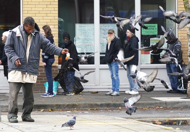 11月4日,在美国俄勒冈州波特兰,无家可归者在街头喂鸽子。新华社记者 吴晓凌 摄