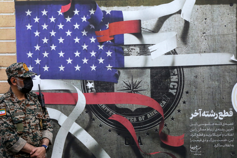 11月4日,在伊朗首都德黑兰举行的集会上,安全人员站在反美宣传画前。