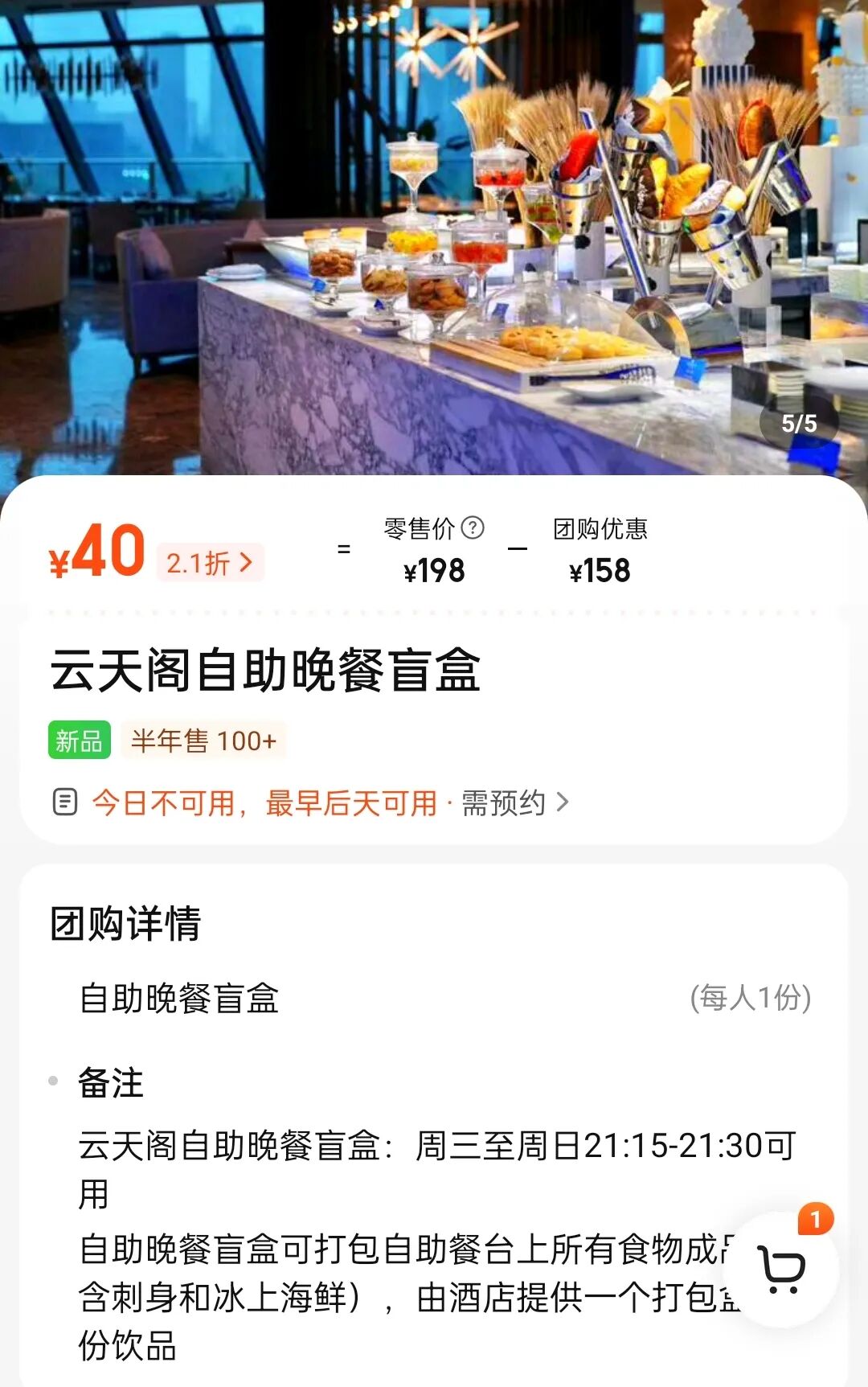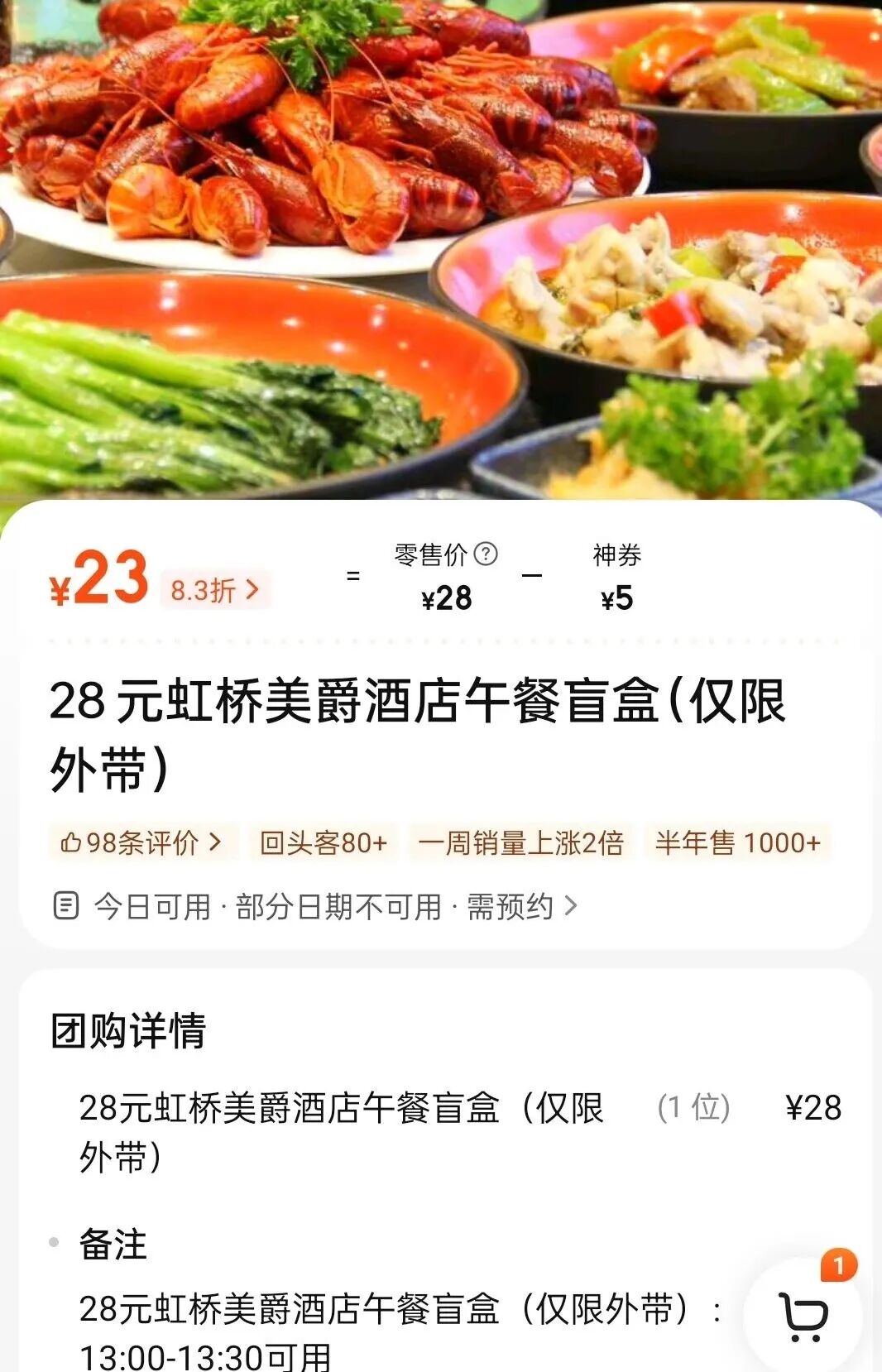 此外,上海虹桥雅高美爵酒店的自助餐厅近期也推出了28元的午餐盲盒。团购详情中显示,午餐盲盒仅限外带,周一到周日13:00-13:30可用,每日六道热菜轮换。