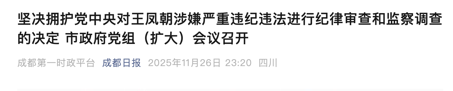 11月26日,成都市政府党组(扩大)会议召开,通报中央纪委国家监委对王凤朝涉嫌严重违纪违法进行纪律审查和监察调查的决定,传达市委常委会会议精神,研究贯彻落实举措。与会同志作了发言,一致表示坚决拥护党中央决定,坚决拥护中央纪委国家监委决定。