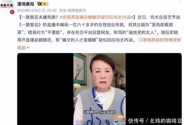 还有她跟向太的过节,之前在综艺上,她明里暗里嘲讽60多岁创业失败的女人,说“有些人就是不自量力”。 向太看不过去,含沙射影提“姓史的女人”。