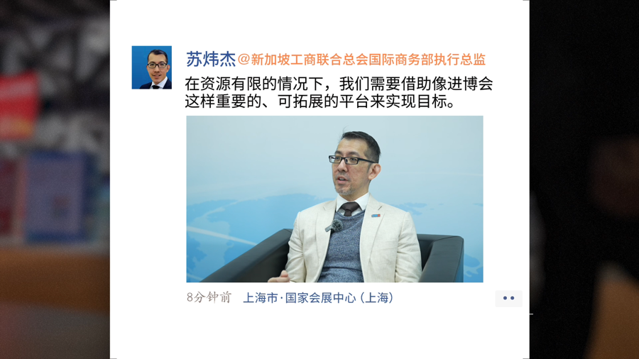 第八届中国国际进口博览会(简称“进博会”)开幕。这是苏炜杰第一次来到进博会,他是新加坡工商联合总会(SBF)国际商务部的执行总监。此次,新加坡工商联合总会率领57家新加坡企业参会。